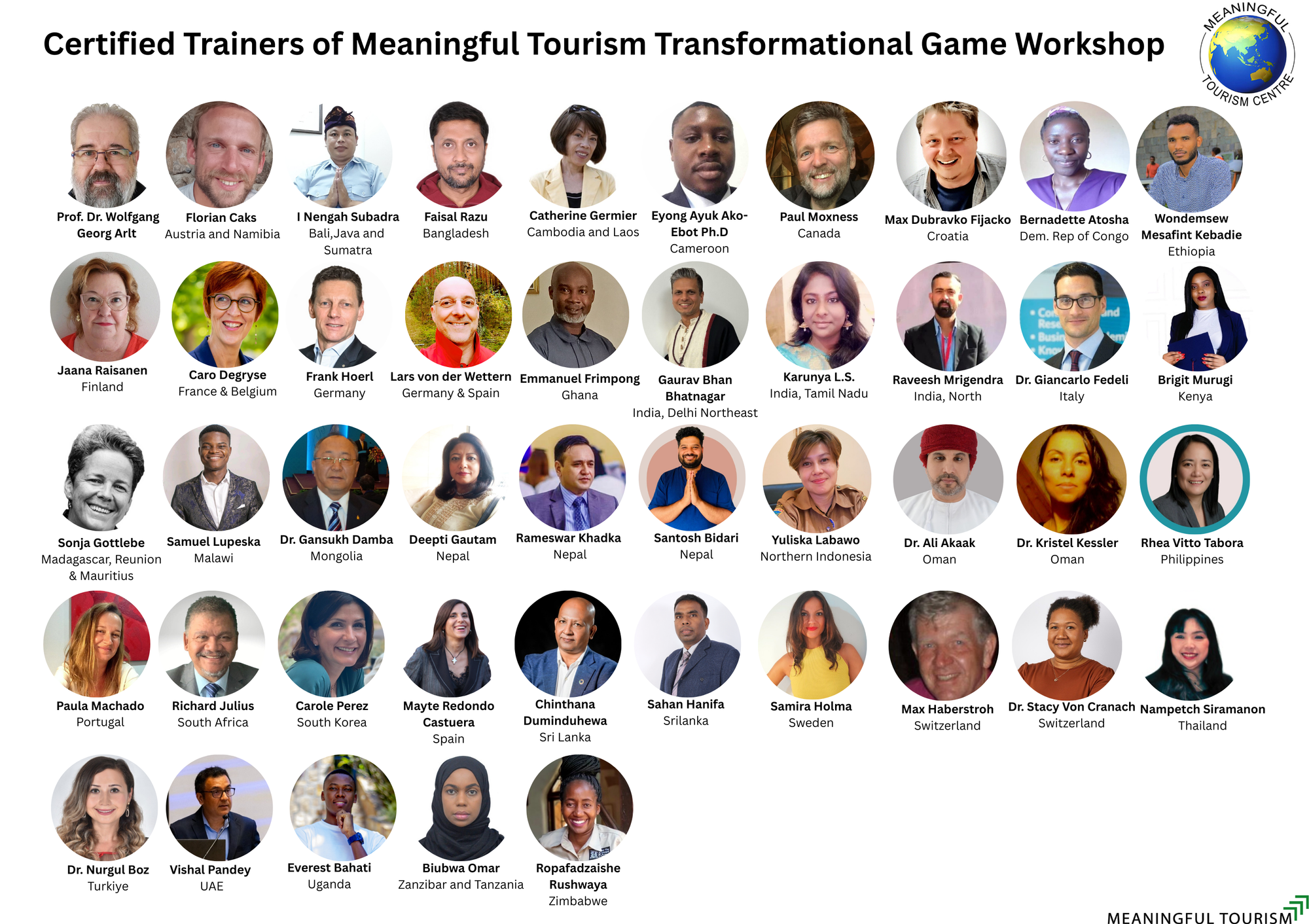Please find below the overview of all our Certified Trainers for the Meaningful Tourism Transformational Game Workshop, along with the World Map showing the countries directly and indirectly covered at present.
