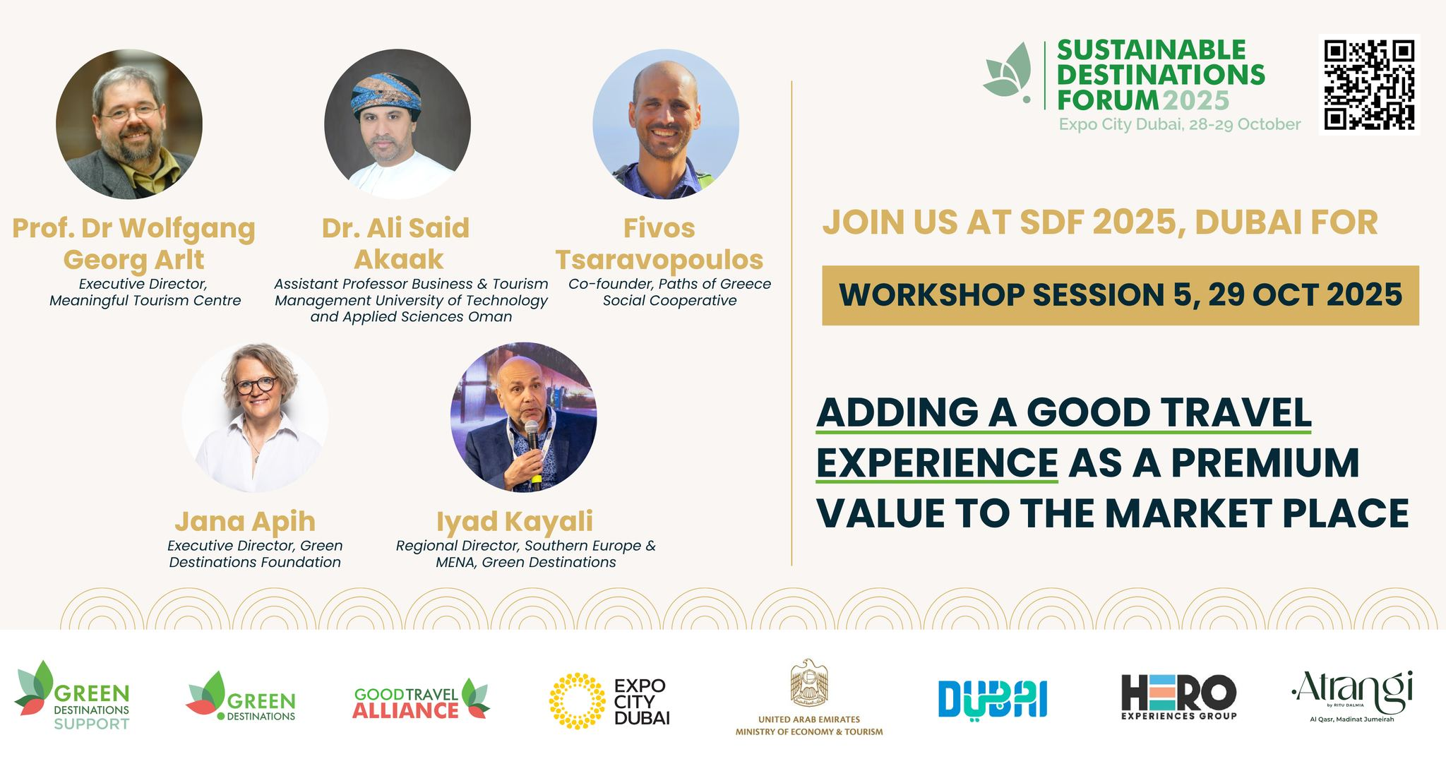 Prof. Dr. Wolfgang Georg Arlt and Dr. Ali Akaak (Meaningful Tourism Trainer for Oman) will speak at the Sustainable Destinations Forum (SDF) 2025 Day 2 Workshop Session 5 titled "Adding a Good Travel Experience as a Premium Value to the Marketplace."