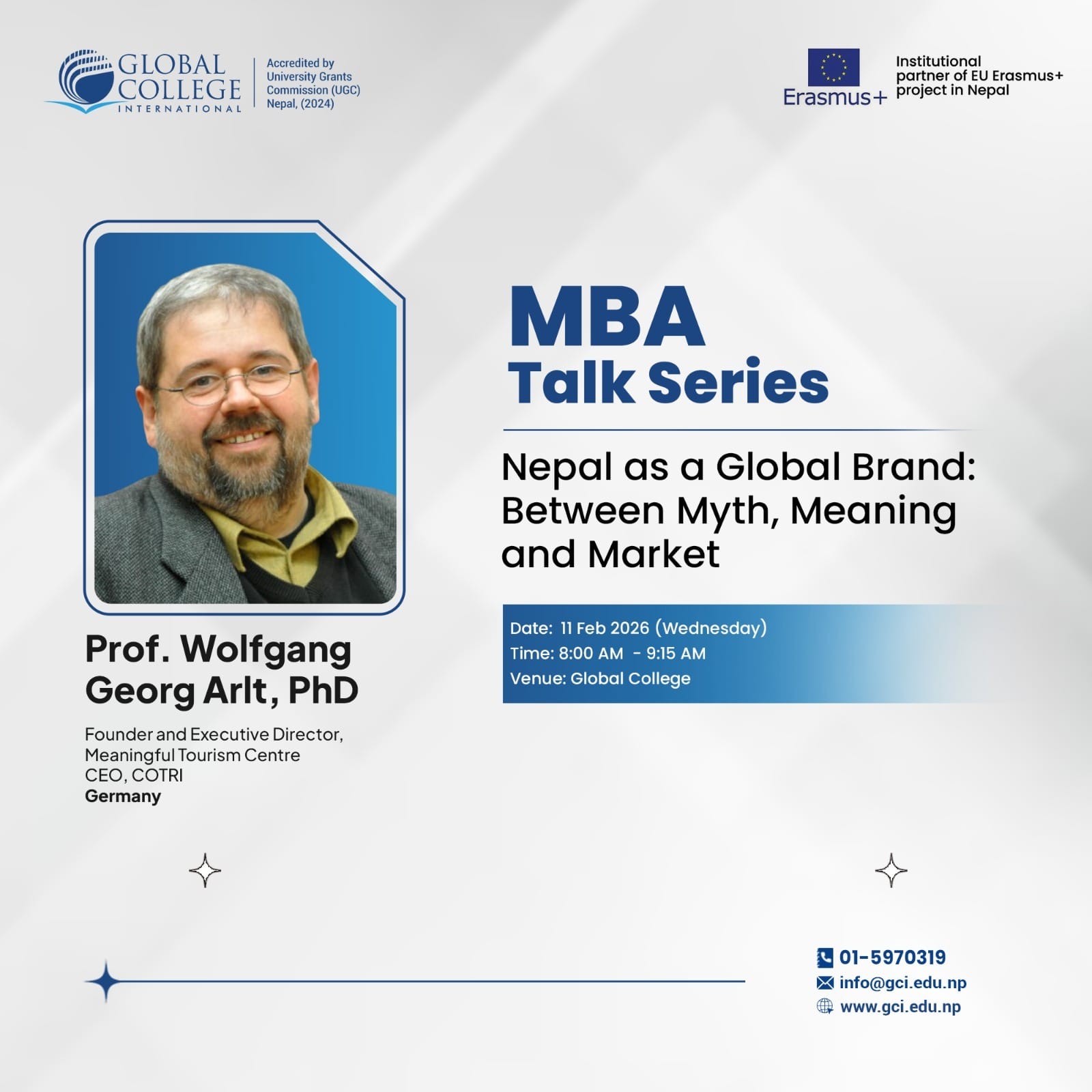 Prof. Dr. Wolfgang Georg Arlt, Founder and Executive Director of the Meaningful Tourism Centre and CEO of COTRI, will deliver a keynote lecture at Global College International's MBA Talk Series on February 11, 2026, titled "Nepal as a Global Brand: Between Myth, Meaning and Market."