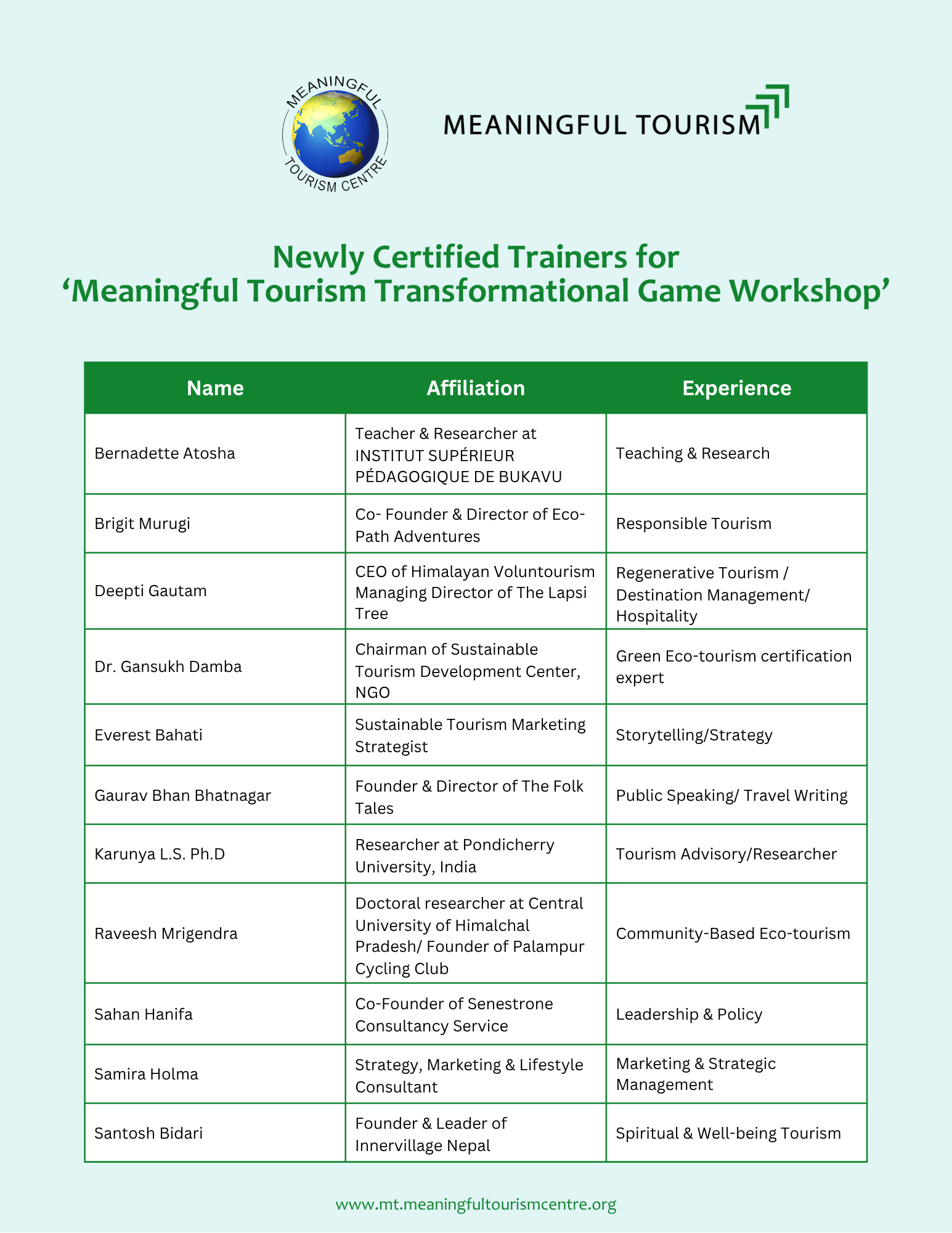 In the upcoming editions of Meaningful Tourism Weekly, we will interview each of them to learn more about their background and the framework for supporting Meaningful Tourism in their respective countries.